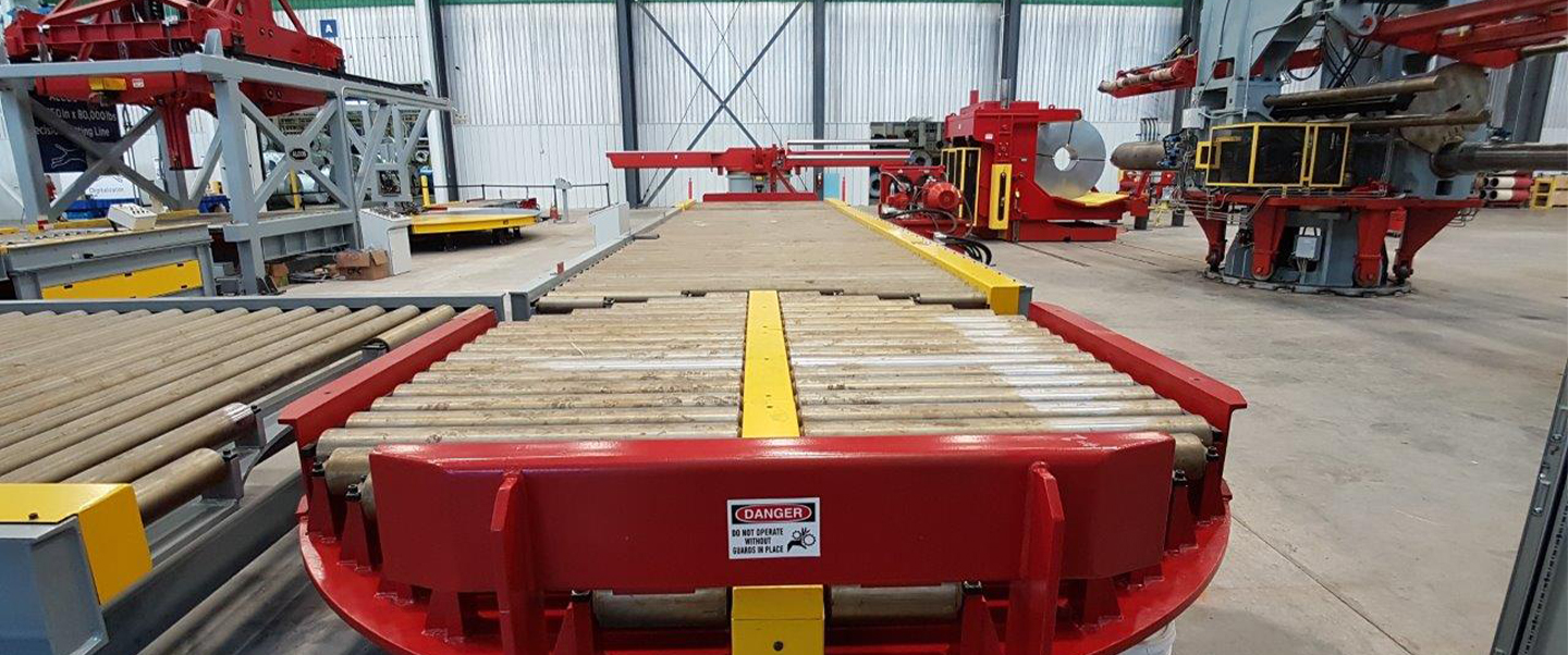 Packaging Lines are synchronous machines that can work integrated or separately with the slitting lines for efficient and high-speed use of the slitting lines. The slitting process can be carried out very quickly and a single coil can be sliced into up to 40 pieces. Turnstiles are stacked up to 4 arms and from there a bottleneck occurs. Packaging lines are the most efficient way to overcome this bottleneck. After taking the material from the turnstile, the packaging lines ensure that the tasks of tipping the sliced coil, strapping, weighing single slices, making multiple stacks, adding pallets and packaging are carried out synchronously.